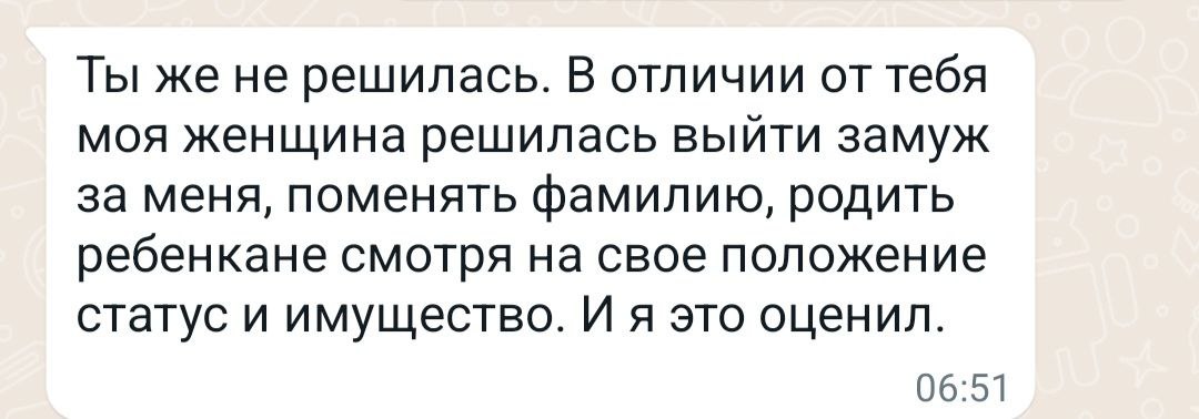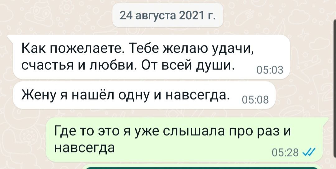 Мне также говорил, что женился раз и навсегда. В ночь перед тем как окончательно утилизировать, сказал что хочет новые отношения и новую семью. Вот это была правда.