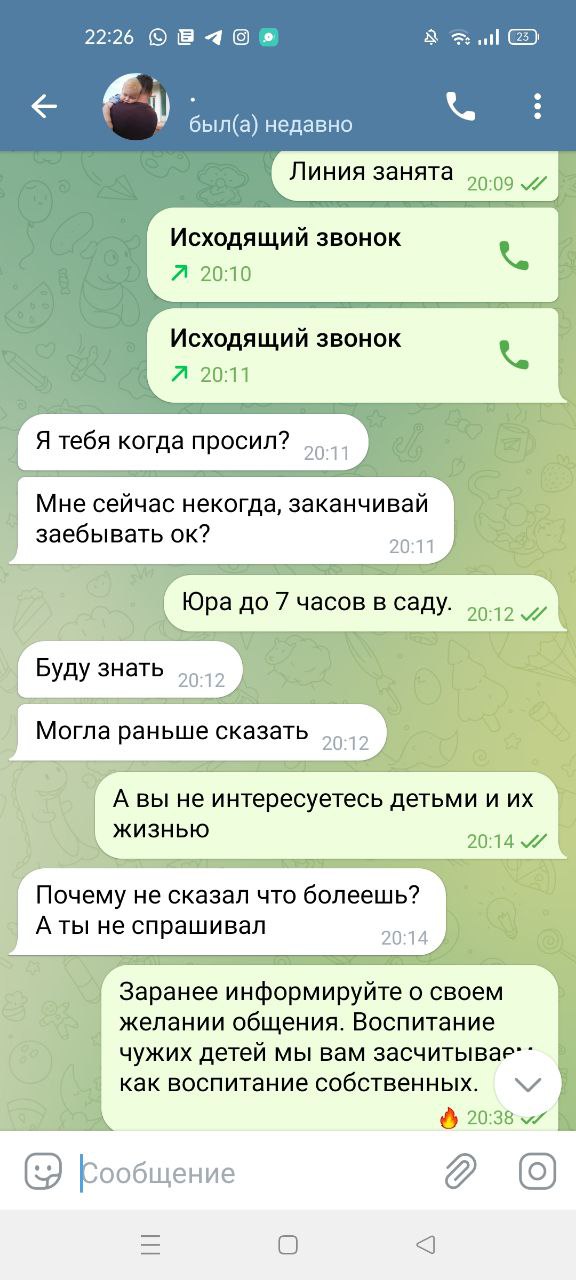 Кать, прям как у нас было! Просто вот как к себе домой, без предварительного звонка, тупо в домофон пиликает. Вообще посрать на график ребёнка. Знает, что мою ее в 20.00, пишет, что задерживается, просит подождать, типа приеду тоже помыть, по итогу, в районе 21.00 появляется… я пару раз так ахуела , потом плюнула, перестала слушать его. Попросили погулять - опоздает минут на 20-30, а это с мелким ребёнком огромное время. Посидеть с ней - через 30 мин заебывает смс, скоро ли я …