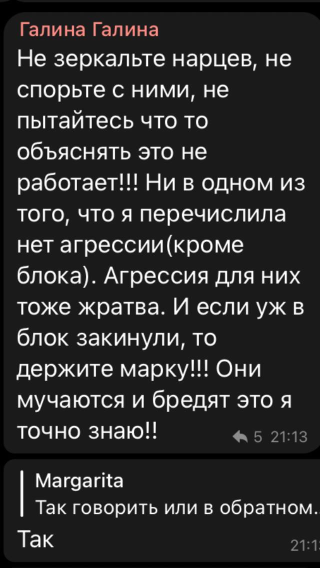 В прошлый раз когда я его заблочила везде, просто тотал, он со своим сахарным шоу без вазелина в жопу залез, и вот. Я с ребенком на руках) мне кажется, если делать что то осознанно, то опять таки слушать себя, как комфортнее самой себе. Полный блок, либо вообще не блок и игнор. Лучше чтоб самой комфортно было. Они на блок тяжелейшей артиллерией идут, не каждая устоит. На фазе медленного раскачивания соскочить еще хоть как то можно, очухаться.