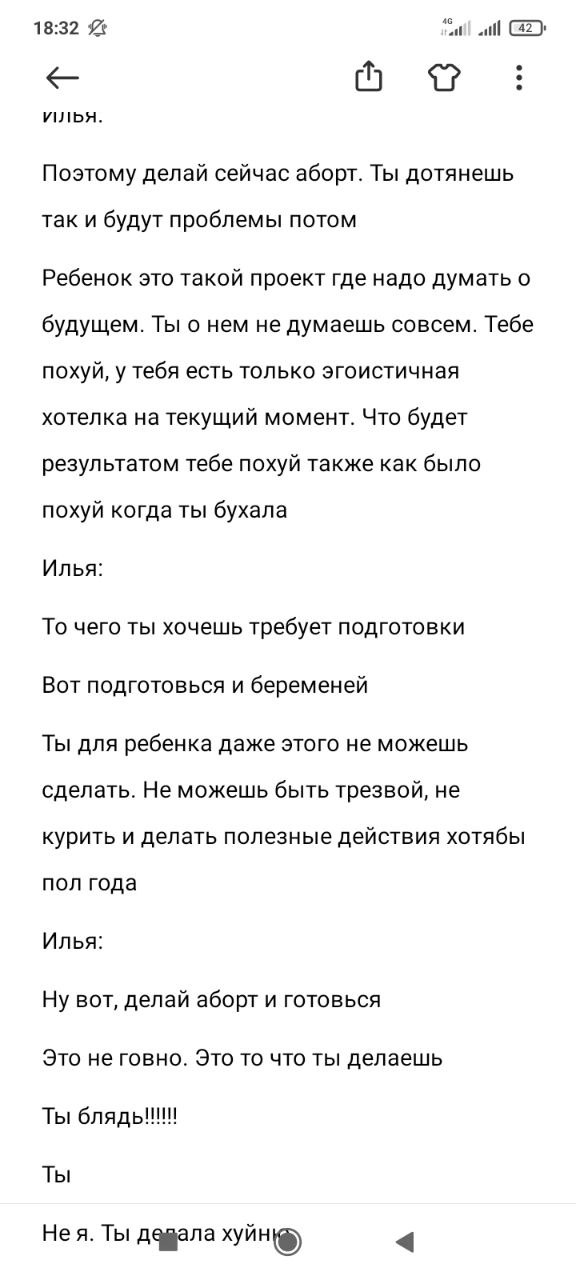 Я загремела в больницу, сделали лапароскопию, было подозрение на внематочную беременность, её не оказалось. Нарц мне привёз продуктов, я ему сказала спасибо, сидим на лавочке и он такой:ну на аборт то записывайся скорее... У меня сразу настроение упало. Сейчас он атакует меня своими проекциями. Я его игнорю, посылаю на хрен. Сейчас отправлю скрин, с его сообщениями, всё скопировала специально для себя, чтоб вспоминать какое он говно😂
