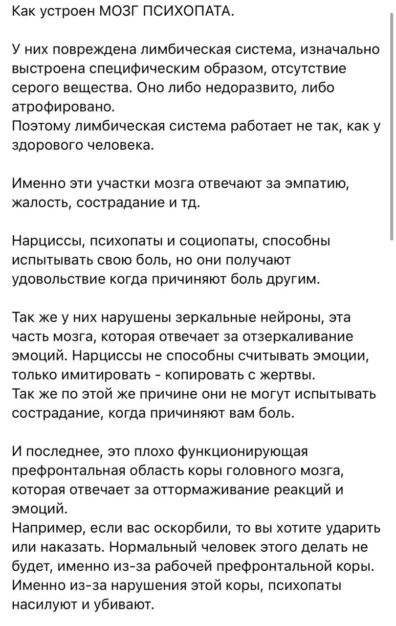 Вот вы меня понимаете! Спасибо! Мне сложно это описать словами, так чтобы понятно было. Но, происходит именно так, сначала он делает всё чтобы вывести из себя, а потом просто пожинает свои плоды и продолжает муку. Вот именно, что с надменным, спокойным видом он глядя в глаза будет говорить, да тебе лечиться пора, ты ведёшь себя как ненормальная. А потом ещё включит игнор и всем своим видом будет показывать что он не удостоит даже взглядом ту которая ему что-то там вякала. И ты в полном сначала бешенстве понимаешь что нихера не можешь сделать, он реально занял главенствующее положение и тебя же выставил как бестолковую, не нормальную. И он кайфует от этого осознания, что я бешусь, мысли там всякие в голове перекручиваю, главное что они связаны с ним, о нем все, о нем! И можно в это время хоть уходить, хоть уезжать. Это ощущение проигрыша остаётся. А он продолжает игнор и продолжает купаться в своей победе, может месяц, а то и больше. А потом, будто ничего и не было либо позвонить либо по другому дать о себе знать и вести себя так как будто он соизволяет с ним общаться заново. И вот когда в этот раз его посылаешь, включат и обояние или обвинения в неспособности быть более договороспособной, короче опять нажимает на те рычаги, на которые знает уже наверняка, что я среагирую. Я за 22 года с ним стала такой токсично, что мне уже от самой себя иногда бывает тошно. С июля с ним не живу, а всё это говно из меня никак не повылазит чтобы мне самой же легче дышалось. А в периоды когда меня заново накрывает волной ненависти к нему ох как мне плохо, мне плохо! Обратите внимание, не ему. И вот именно про это я тут пишу, ненависть, она нужная безусловно, но она же и разрушает нас самих. Я это чувствую.