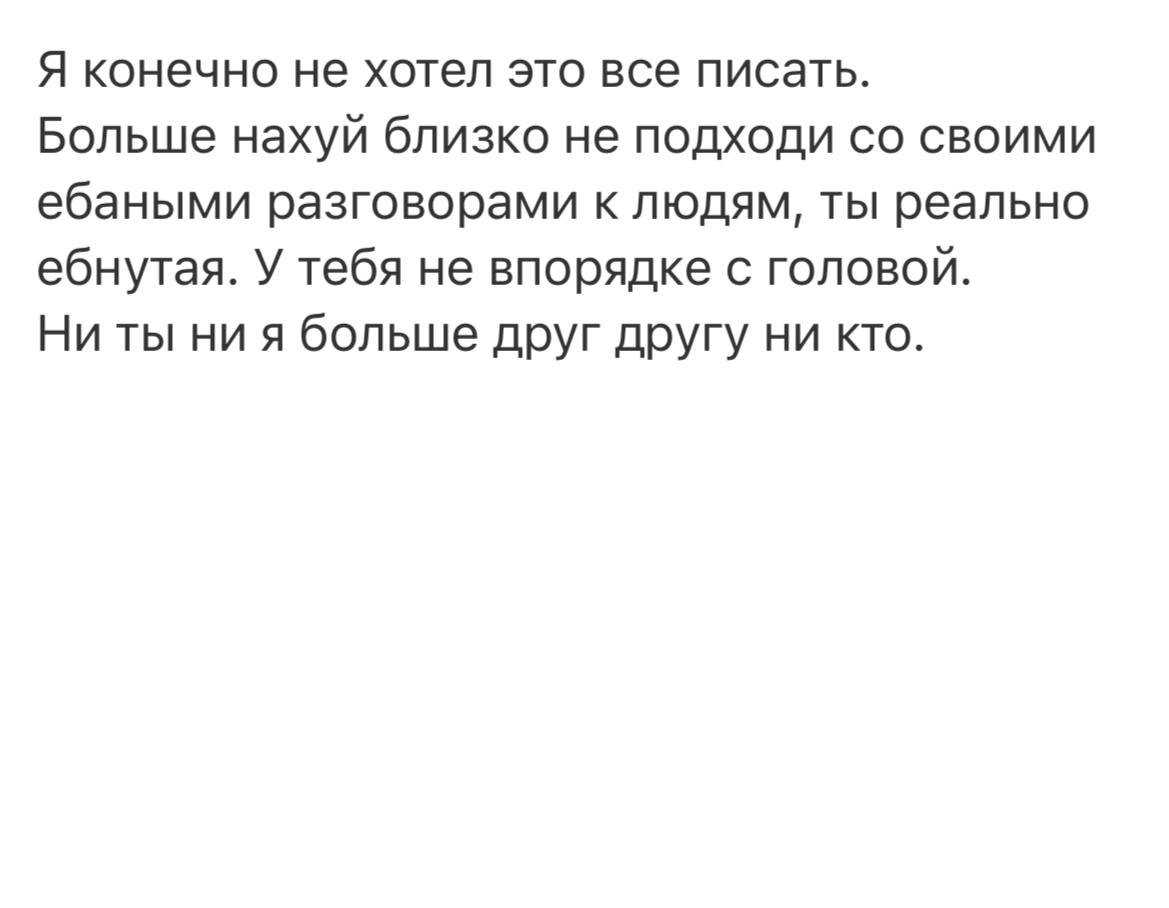 Он ещё меня в марте этого года довёл, его девка мне писала в инсте что я неадекватная и больная, я ему крикнула «ты своей малолетке рот закрой, дайте мне родить спокойно, а не то я чугунной сковородкой тебя огрею!», короче он схватил кроссовки и убежал из квартиры аж без верхней одежды, так испугался, что я его ударю😂 А потом мне сказал «ты руки не распускай, если ударишь меня - я побои сниму и заявление на тебя напишу!», так на минуточку, этот скандал был за 3 дня до моих родов. Побои он снимать собрался🤦🏼♀️