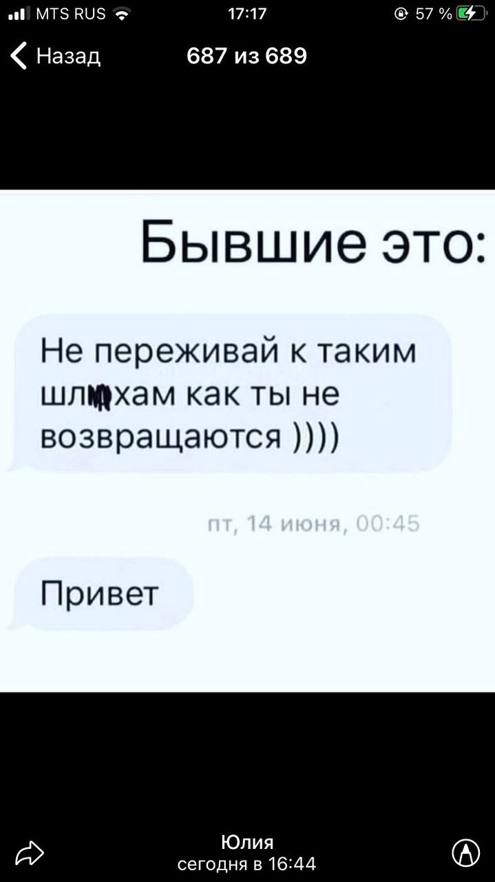 Я даже не могу сказать, что хочу его вернуть. Но вот знать, что щас у него «идеализация» с новой бабой, для меня просто жуть. И даже мысль о том, что она потом все равно получит моральную травму, меня не утешает. Сейчас-то королева - она.