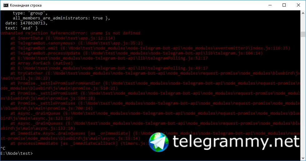var query = connection.query('INSERT INTO tabl (from_id,chat_id,uname,fname,) VALUES ('+from_id+','+chat_id+','+uname+','+fname+')', function(err, result) {