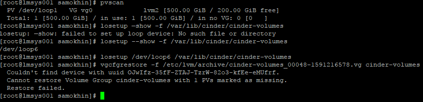 "pvscan" и последующее "losetup —show -f /var/lib/cinder/cinder-volumes" выводит "/dev/loop2" например, что означает что хост знает о существовании такого physical volume, как я понимаю. Однако, когда я после "losetup /dev/loop2 /var/lib/cinder/cinder-volumes" пытаюсь восстановить его по uuid и restorefile, пишет что такого uuid не найдено и диск не может быть восстановлен, как впрочем и группа.