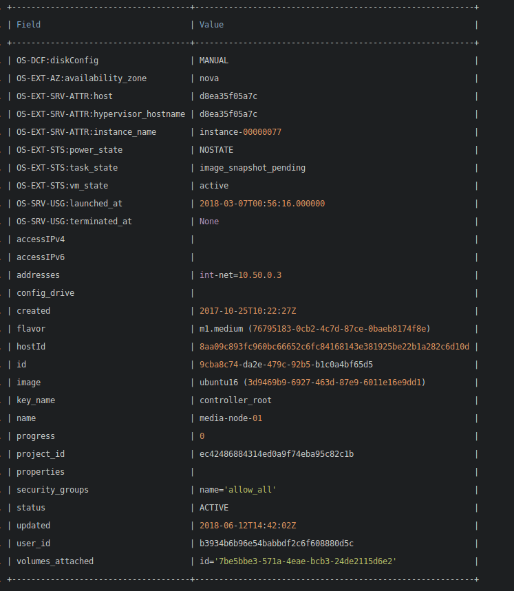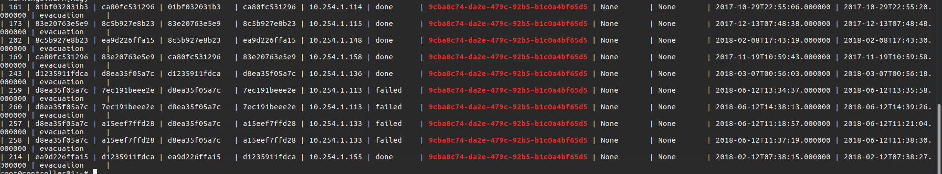 | 258 | d8ea35f05a7c | a15eef7ffd28 | d8ea35f05a7c | a15eef7ffd28 | 10.254.1.133 | failed | 9cba8c74-da2e-479c-92b5-b1c0a4bf65d5 | None | None | 2018-06-12T11:37:19.000000 | 2018-06-12T11:38:30.000000 | evacuation |