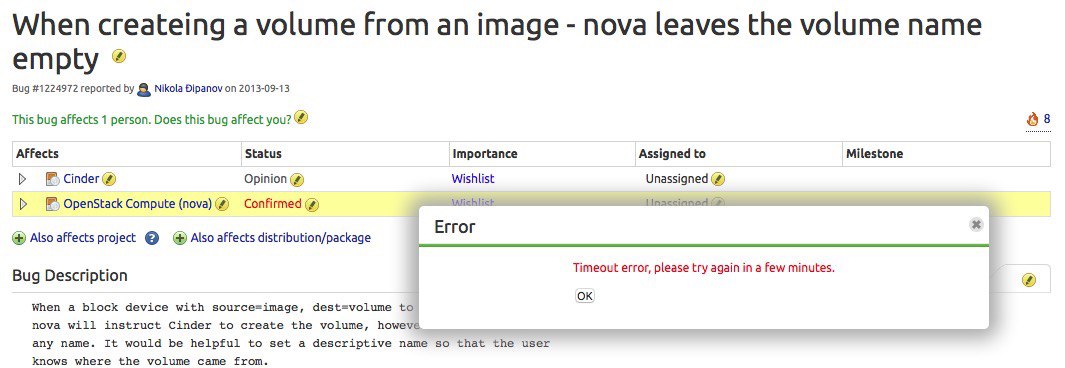 Когда осенью добавляли возможность передать volume type при nova boot, я попросил заодно и volume name добавить, и ответ был такой, будто им предлагают поделиться всеми органами, а дом отдать бездомным. Будто один параметр в proxy API это хуже, чем многолетний баг в техническом долге под названием Nova.