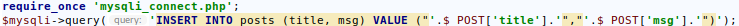 $mysqli->query('INSERT INTO posts (title, msg) VALUE ("'.$_POST['title'].'","'.$_POST['msg'].'")');