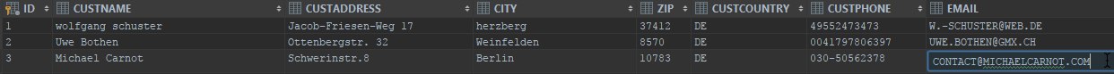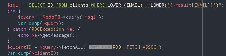 это в датагрипе на той же базе выполнить SELECT ID FROM clients WHERE LOWER(EMAIL) = LOWER('contact@michaelcarnot.com'), хотя и без второго LOWER и вообще в любом варианте пусто
