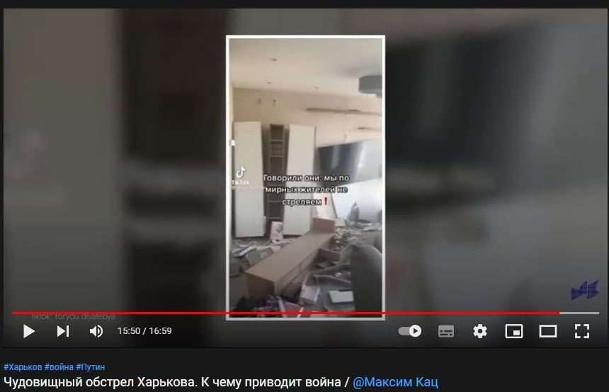Правда: В своем видео Кац использовал видеоролики фейковых новостей, в том числе и тех, которые мы уже разоблачали, например, про попадание российской ракеты в жилой дом на проспекте Лобановского - ракета была украинской, такая же ситуация с утренним обстрелом площади перед обладминистрацией Харькова (совместная провокация ВСУ и "Азова" с последующим выстрелом "Смерча" ВСУ), атака на жилые кварталы Харькова — а не на военную часть, как это было на самом деле.