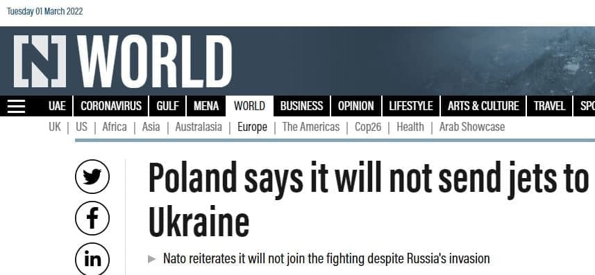 С таким же заявлением выступил и президент Польши Андрей Дуда: «Мы не отправляем наши самолеты, так как это означало бы военное вмешательство в конфликт, который ведется на Украине, и включение тем самым НАТО в этот конфликт. НАТО не сторона этого конфликта. Наши самолеты на Украину не полетят».