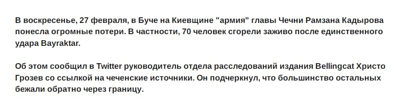 🔥Всего на территорию Украины зашло 250 единиц техники и более 1,5 тысячи личного состава бойцов Чеченской Республики. Но уже 26 февраля на подступах к Киеву в районе Гостомельского аеропорта кадыровцы были разгромлены ВСУ.