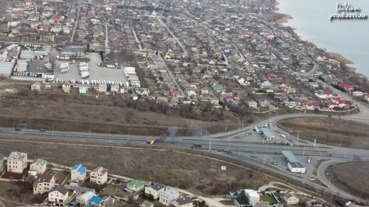 Первые мгновения боя за Антоновский мост под Херсоном, снятые местным жителем с квадрокоптера. Слева два БРДМ-2 ВСУ и 2-3 отделения пехоты ведут огонь в сторону российских позиций (и получают в ответ) по правую сторону кадра, где возле заправки стоят покинутые "Уралы" и "Мсты-Б", одна из которых развернута на прямую наводку.