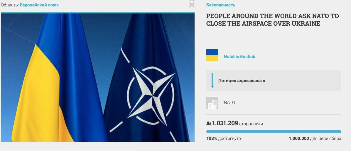 Фейк: НАТО закроет небо над Украиной благодаря подписям, собранным под петицией, сообщают украинские телеграм-каналы. Ранее Зеленский в разговоре с канцлером ФРГ просил обеспечить бесполетную зону над страной.