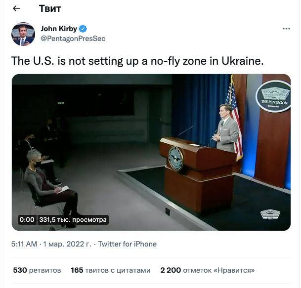 Правда: Представители стран НАТО однозначно заявили: небо над Украиной они закрывать не будут. Президент США Джо Байден ясно дал понять – американские войска не собираются воевать с Россией на Украине. Об этом на брифинге для журналистов заявила официальный представитель Белого дома Джен Псаки. Того же мнения придерживаются премьер-министр Британии Борис Джонсон и генеральный секретарь НАТО Йенс Столтенберг.