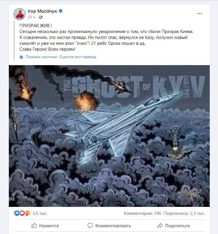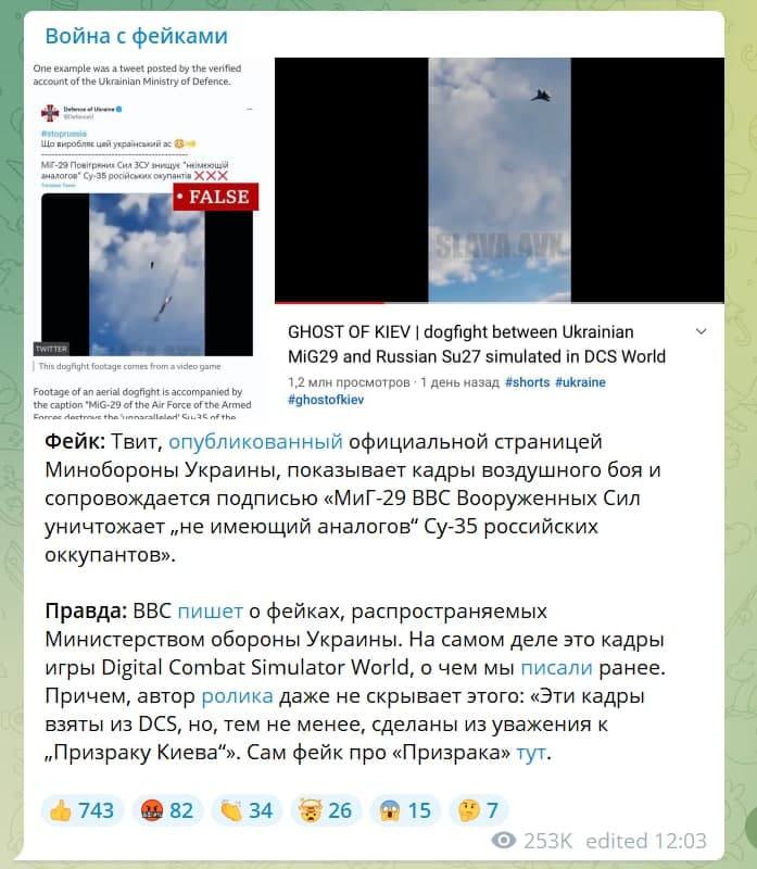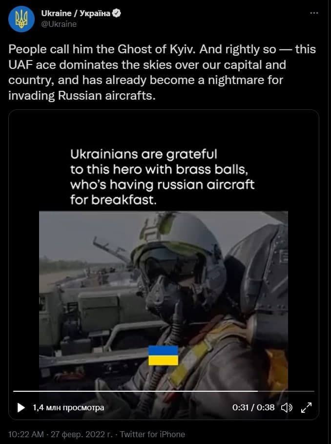 Фейк: «Призрак Киева» уничтожил 21 российский самолет, написал украинский депутат Игорь Мосийчук. В официальном твиттере Украины видео с "призраком" набрало 1,4 млн просмотров.
