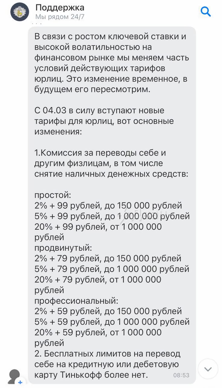 «Тинькофф» без предупреждения ввёл комиссию на перевод любой суммы со своего ИП на свою карту.