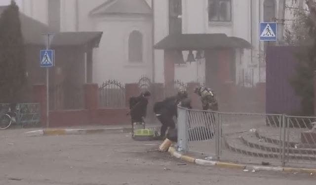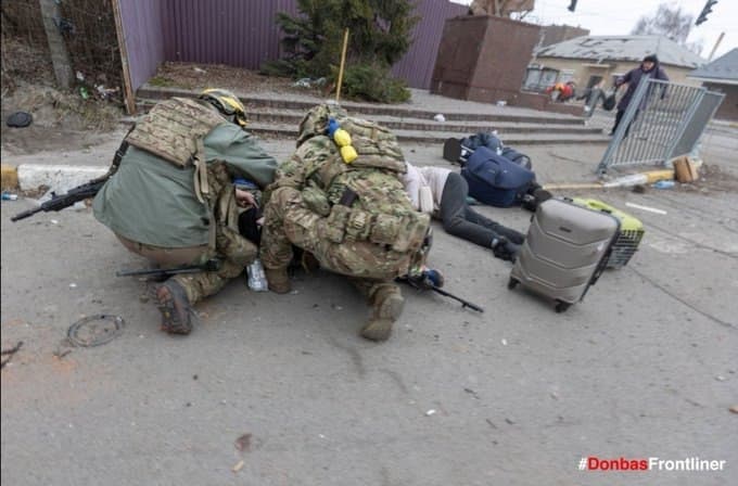 Как на Украине делают фейки. В начале репортажа на земле одно тело. А когда фотограф подбежал ближе, ещё два положили, плюс чемоданы поднесли. И заменили некрасивых теробороновцев на фотогеничных, со свёртнутым по-американски флагом за спиной. Чтоб композиция на фото сошлась, как задумано.