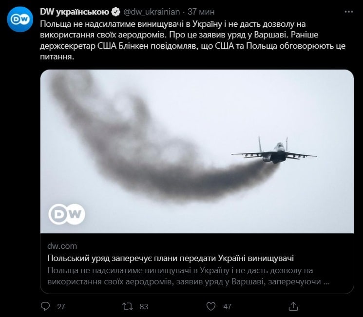 Польша не будет посылать истребители в Украину и не даст разрешения на использование своих аэродромов, об этом заявило правительство в Варшаве. Ранее госсекретарь США Блинкен сообщал, что США и Польша обсуждают этот вопрос.