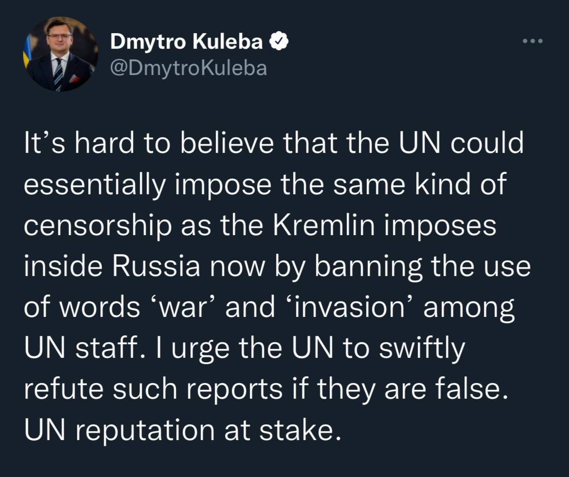 Глава украинского МИД Кулеба уже отреагировал: «Трудно поверить, что ООН могла фактически ввести такую же цензуру, какую Кремль вводит сейчас внутри России» и призвал опровергнуть данную информацию.