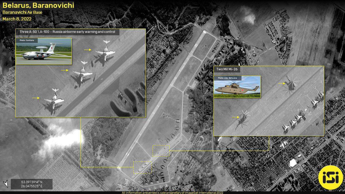Сразу три самолёта дальнего радиолокационного обнаружения и управления А-50(У) ВКС России на аэродроме Барановичи.