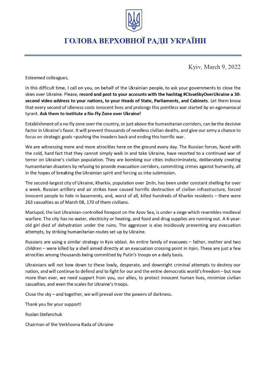 📝 Председатель ВР Стефанчук написал письмо иностранным политикам с призывом закрыть небо над Украиной