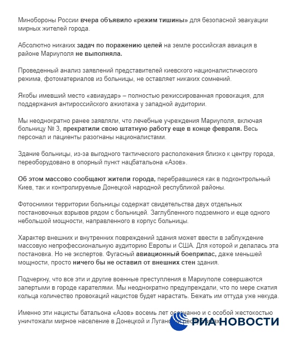 Минобороны России прокомментировало сообщения о якобы нанесенном вчера российской авиацией "ударе" по мариупольской больнице