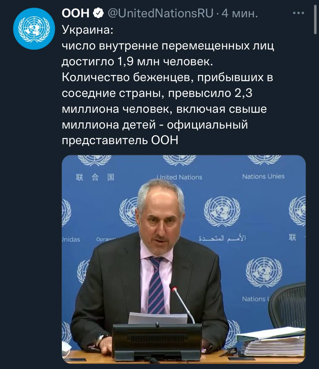 ‼️ Количество беженцев из Украины превысило 2,3 млн человек, — ООН