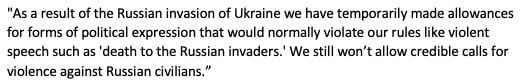 ❗️ Пользователям Facebook и Instagram в некоторых странах разрешат публиковать призывы к смерти по отношению к «русским оккупантам», если в сообщении речь идет о вторжении в Украину.
