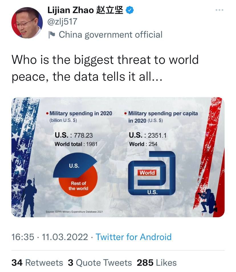 🇨🇳🇺🇸Официальный представитель МИД КНР Чжао Лицзянь в твиттере: Кто главная угроза миру? Данные говорят сами за себя.