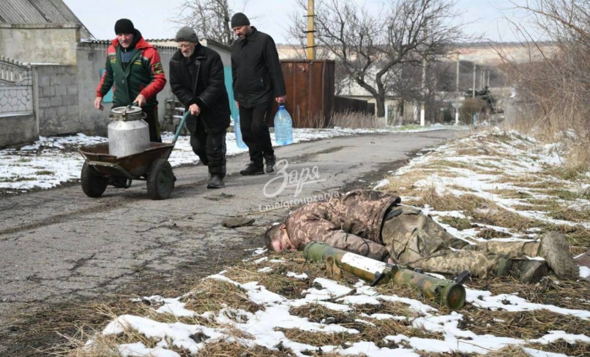 Мирные жители идут за водой, а на обочине лежит убитый украинский военный.
