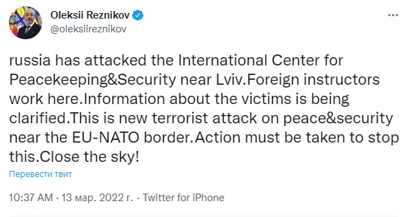 🤡 Министр обороны Украины назвал "террористическим актом" атаку по Яворовскому военному полигону и центру подготовки ВСУ с иностранными инструкторами.