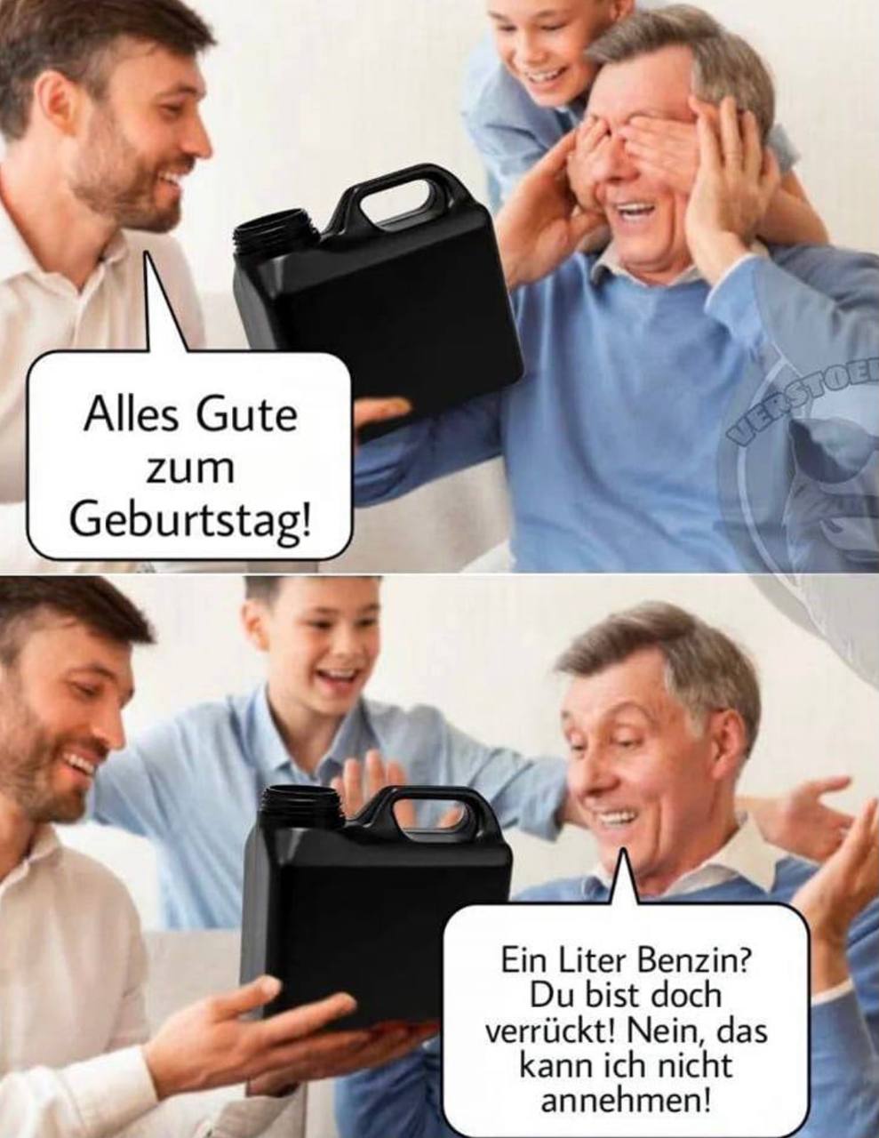 Жителя Германии поздравляют с днём 🎁рождения! Вот подарок литр бензина! Да вы с ума сошли! Нет, я не могу принять такой дорогой подарок!