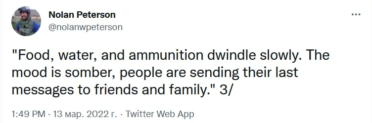Помимо этого, собеседник американского журналиста из рядов иностранных боевиков жалуется на кончающуюся еду, воду, боеприпасы и отсутствие благ западной цивилизации, а также сообщает о мрачных настроениях в рядах боевиков, которые уже прощаются со своими друзьями и семьями.
