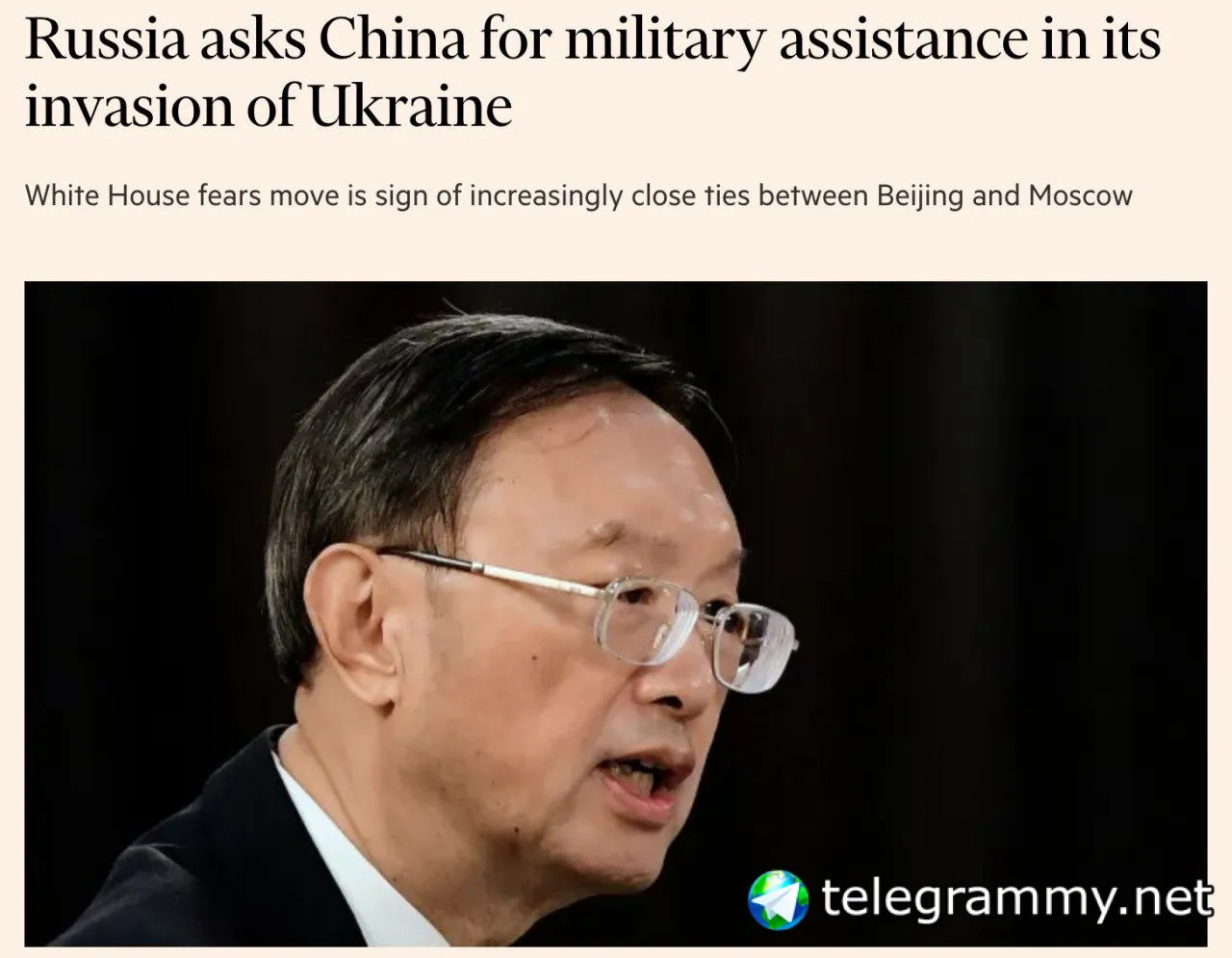 Какое-то официальное лицо США (неважно кто) сообщили в Файненшл Таймс что Россия запросила у Китая военное оборудование и другую помощь с начала вторжения. Про что именно идёт разговор - не уточнил.
