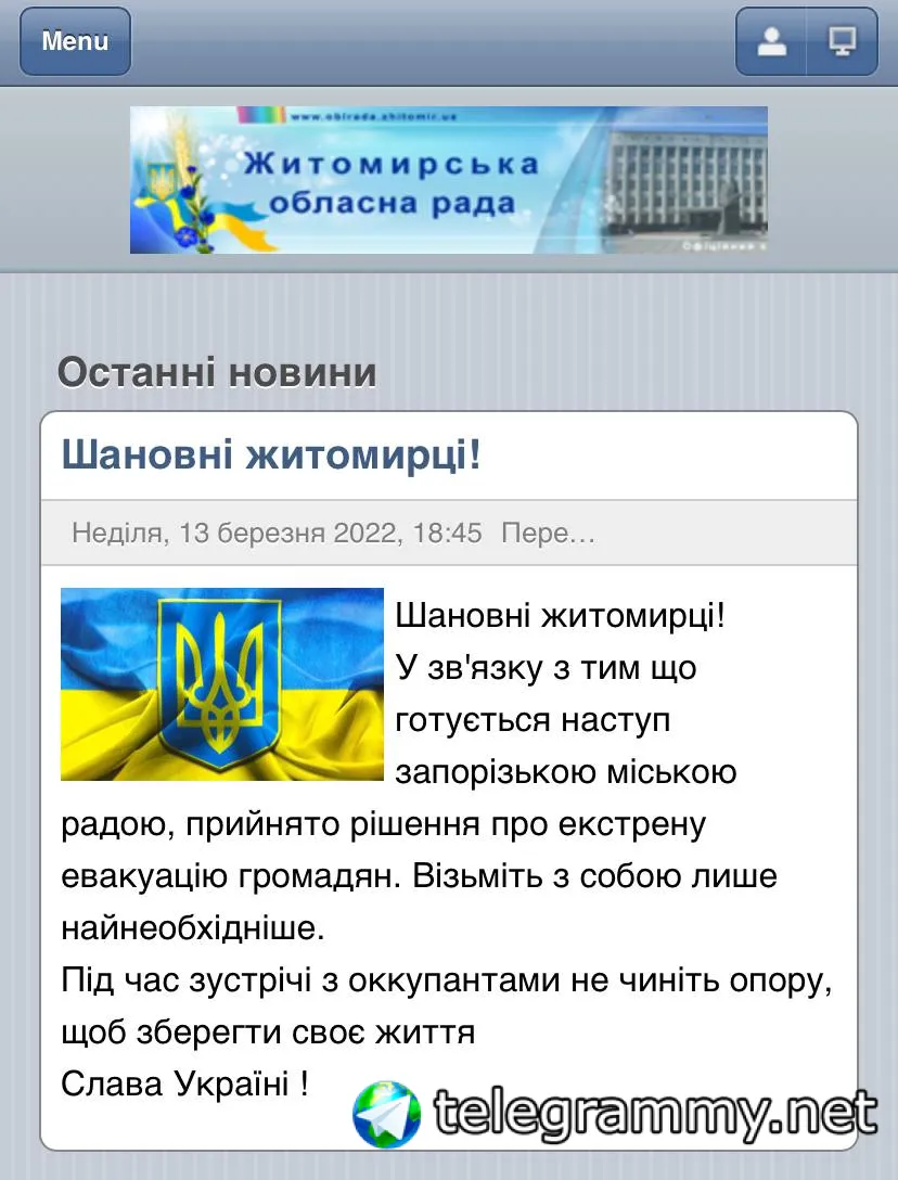 Кроме того, жителей Житомира просят не оказывать сопротивление российской армии.