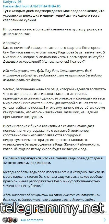 Кадыров уже лям подписчиков в телеге набрал, лол
