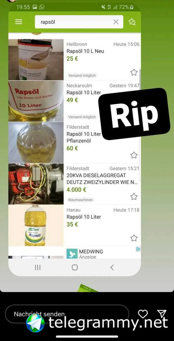 🇩🇪 В Германии на Ebay идет перепродажа рапсового масла - одного из самых дешевых. Чтобы было понятно: эта культура вредная для почв, и поэтому внешнее управление заставило ее выращивать на Украине (не жалко же). А после начала спецоперации и прерывания поставок в Европе случился дефицит. Свой-то агропромышленный комплекс у Европы без колоний не живет