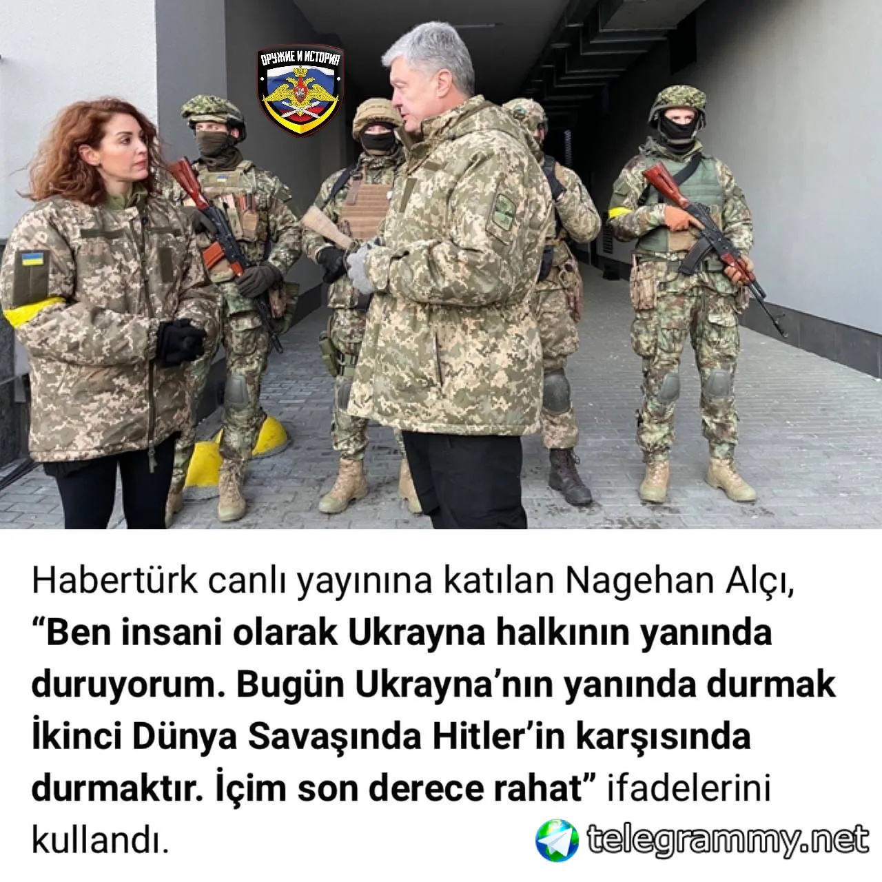 🇺🇦🇷🇺🇹🇷 Турецкая журналистка Habertürk Нагехан Алчи, надев вместо опознавательных знаков СМИ украинскую военную форму, рассказывает: