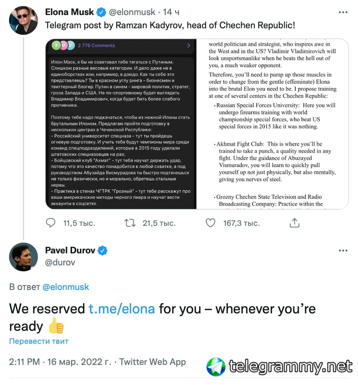 Павел Дуров подключился к диалогу между Илоном Маском и Рамзаном Кадыровым, предложив Маску зарегистрироваться в Telegram