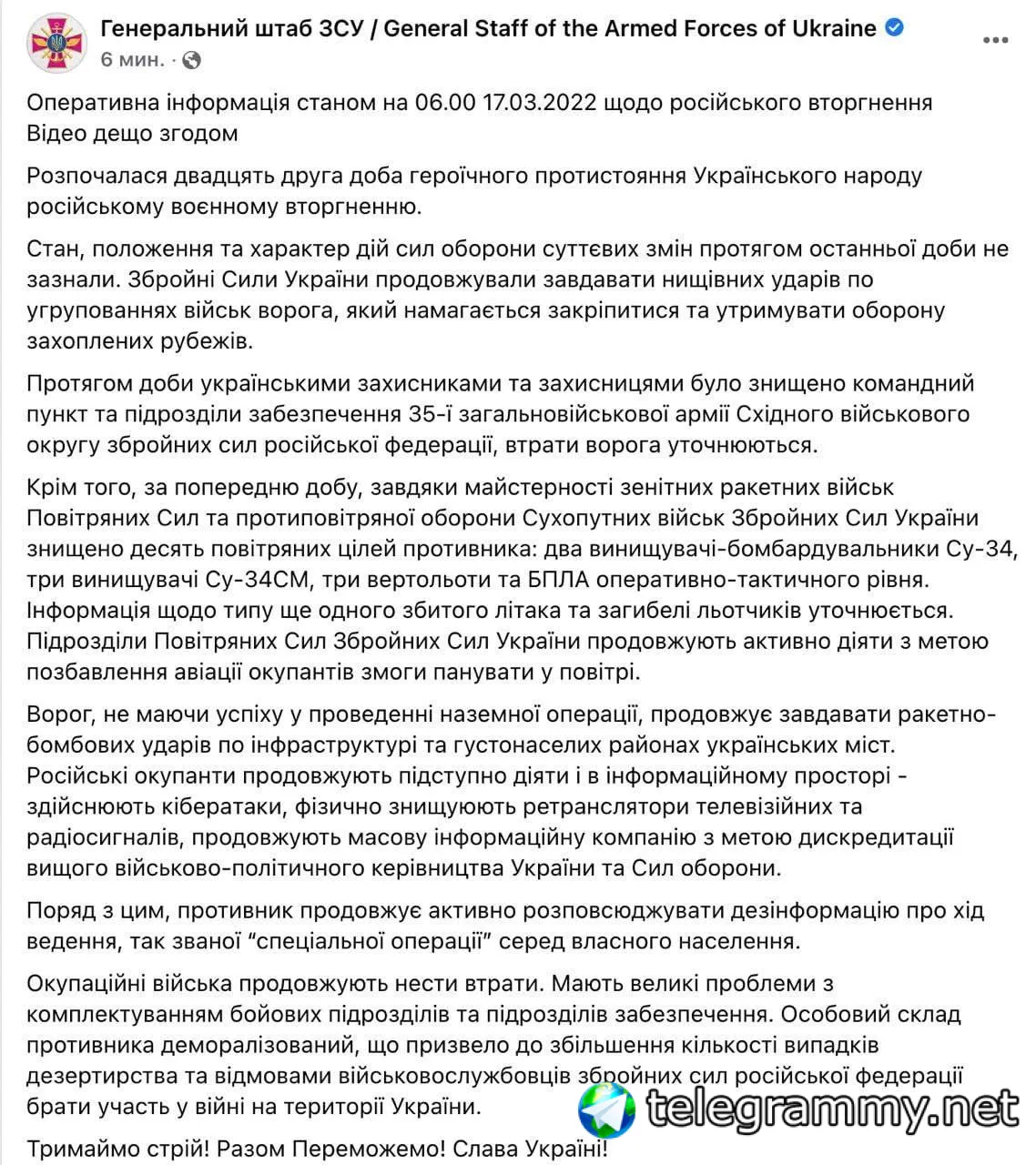 Сводка от Генштаба по состоянию на 06:00 17.03.2022: