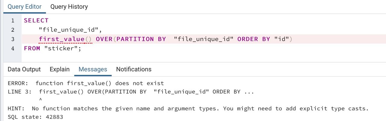 LINE 3: first_value() OVER(PARTITION BY "file_unique_id" ORDER BY ...