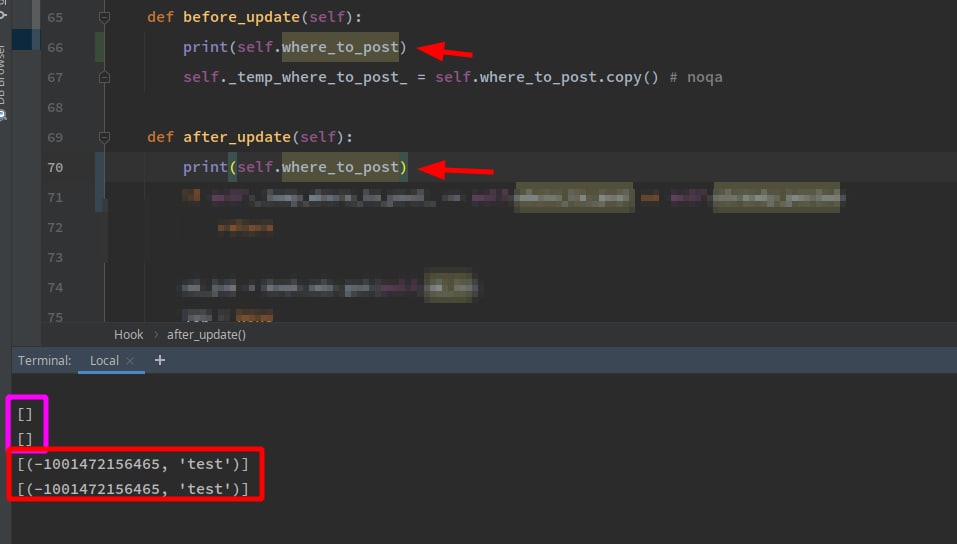 Hi, i have two hooks - before/after update and i print the current status of where_to_post in each hook, somehow i get both the same, as you can see - each pair of two prints [one from before_update and one from after_update] is framed.