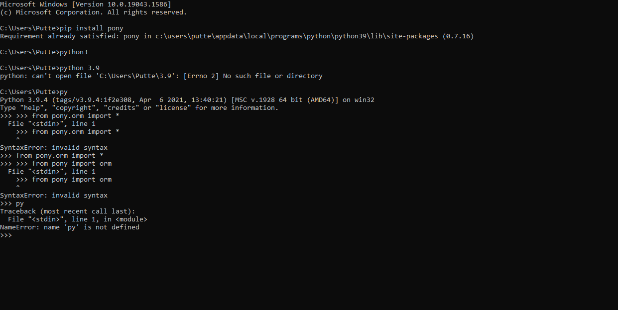 Hello, after succesfullly installing pony with Pip, i continued opening interpreter (by simply using the command ''py''.