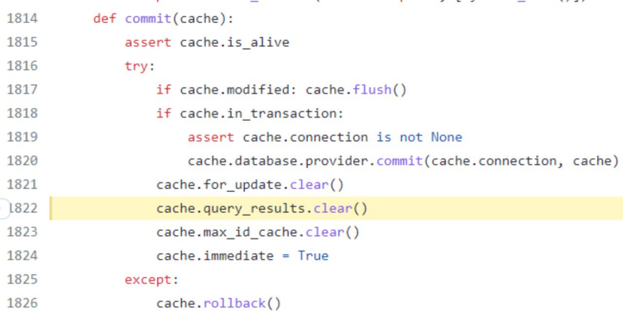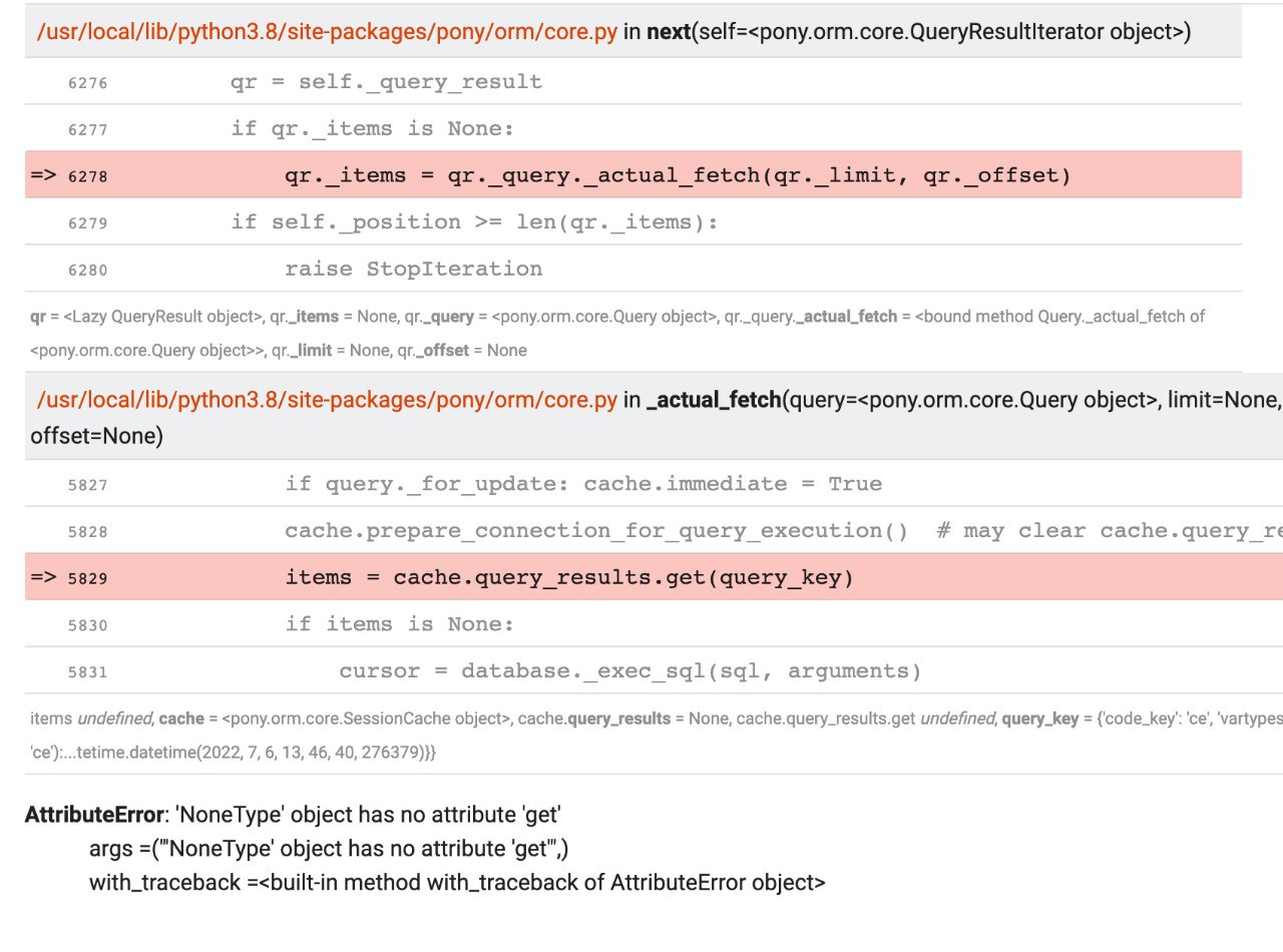 4) The exception causes the rollback of the current session. After the rollback, the cache is removed from the db_session, and cache attributes are cleared. This is the moment when query_results is set to None.