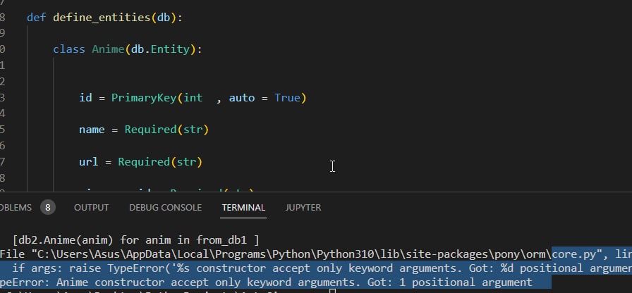 TypeError: Anime constructor accept only keyword arguments. Got: 1 positional argument
