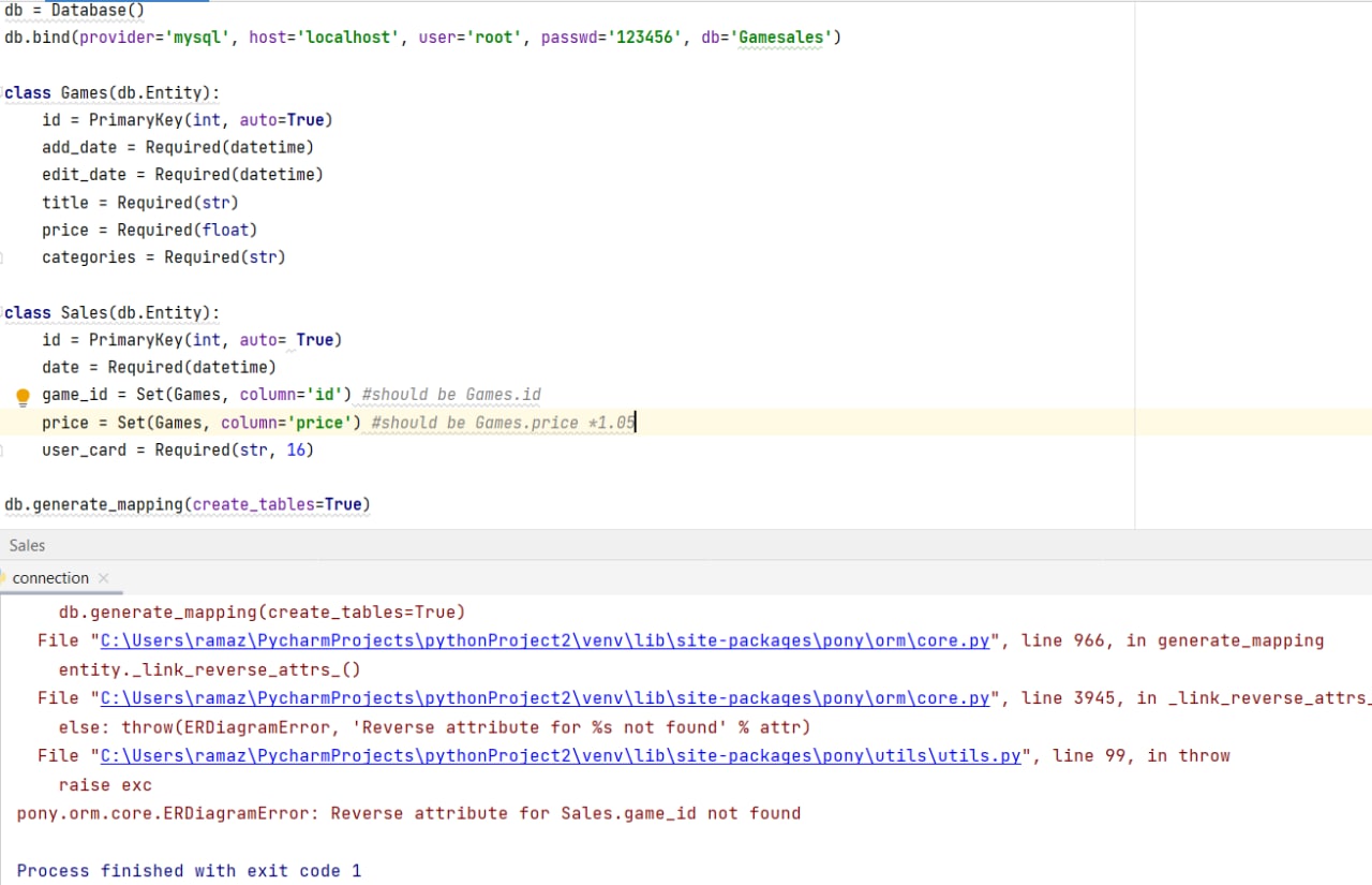 pony.orm.core.ERDiagramError: Reverse attribute Games.Sales not found