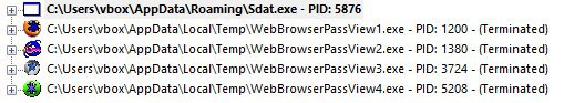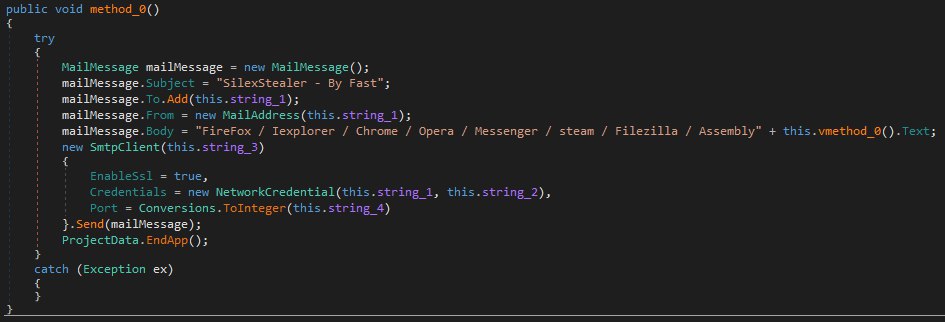 Теперь, sdat.exe - собственно сам стилер - "SilexStealer by Fast". Написан на Visual Basic, обфусцирован с помощью Confuser v.1.9. Деобфусцировать не составляет труда. Судя по всему, стилер с графическим интерфейсом. Обернут в Инжектор. При запуске sdat запускаются ещё четыре процесса - WebBrowserPassView от 1 до 4 с соответствующими иконками браузеров. В итоге ищет пароли от: Firefox (с помощью PasswordFox), Internet Explorer, Chrome, Opera, Messenger (Windows Live), Steam (в случае стима ищет в регистре HKEY_CURRENT_USER\\SOFTWARE\\Valve\\Steam значение SteamPath, то есть собственно путь до установленного стима. В найденной директории ищет SteamAppData.vdf) и Filezilla (в случае файлзиллы ищет хосты, логины и пароли в \FileZilla\\recentservers.xml, предварительно найдя путь до аппдаты). Все полученные данные вредонос отправляет с указанной почты на ту же указанную почту по протоколу SMTP, тема письма - "SilexStealer - By Fast". Адрес, введеный в этот экземпляр вредоноса - e11sm117578ljf.44@gmail.com