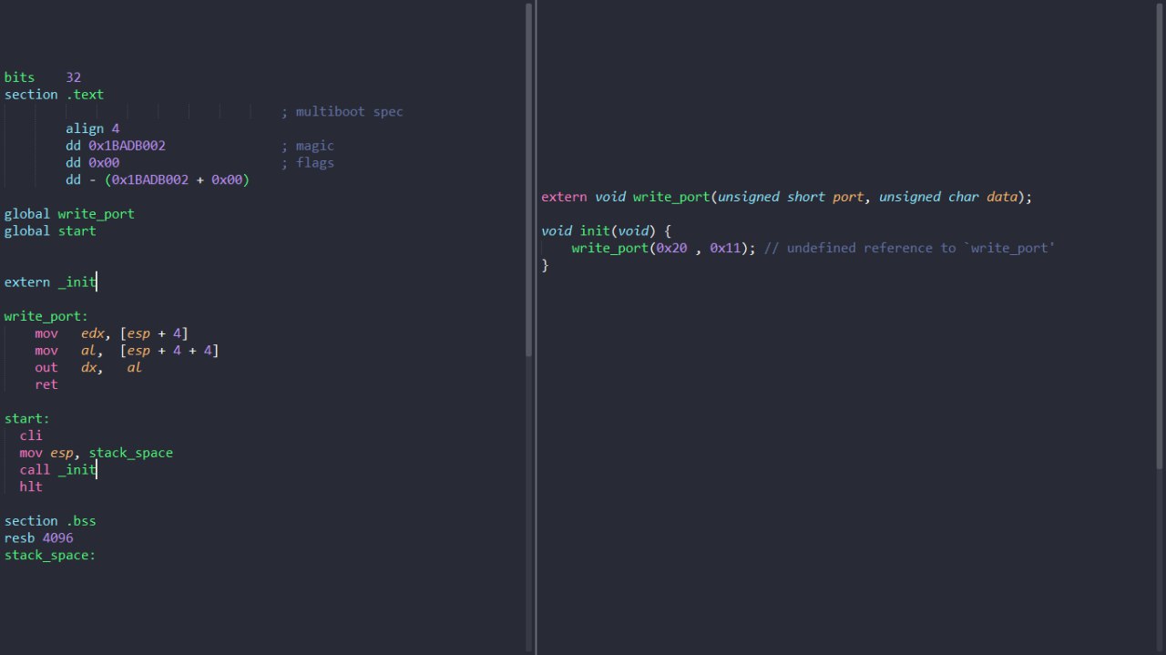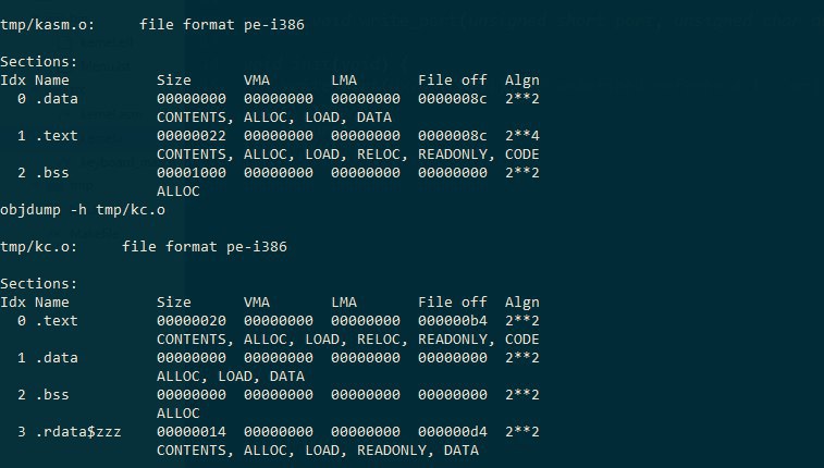 из nasma init виден, из си write port не виден, линкую два pe-i386 файла