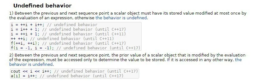 for an int i and int a[3] and function void f(int, int): f(i, ++i); and a[i] = ++i; are also UB